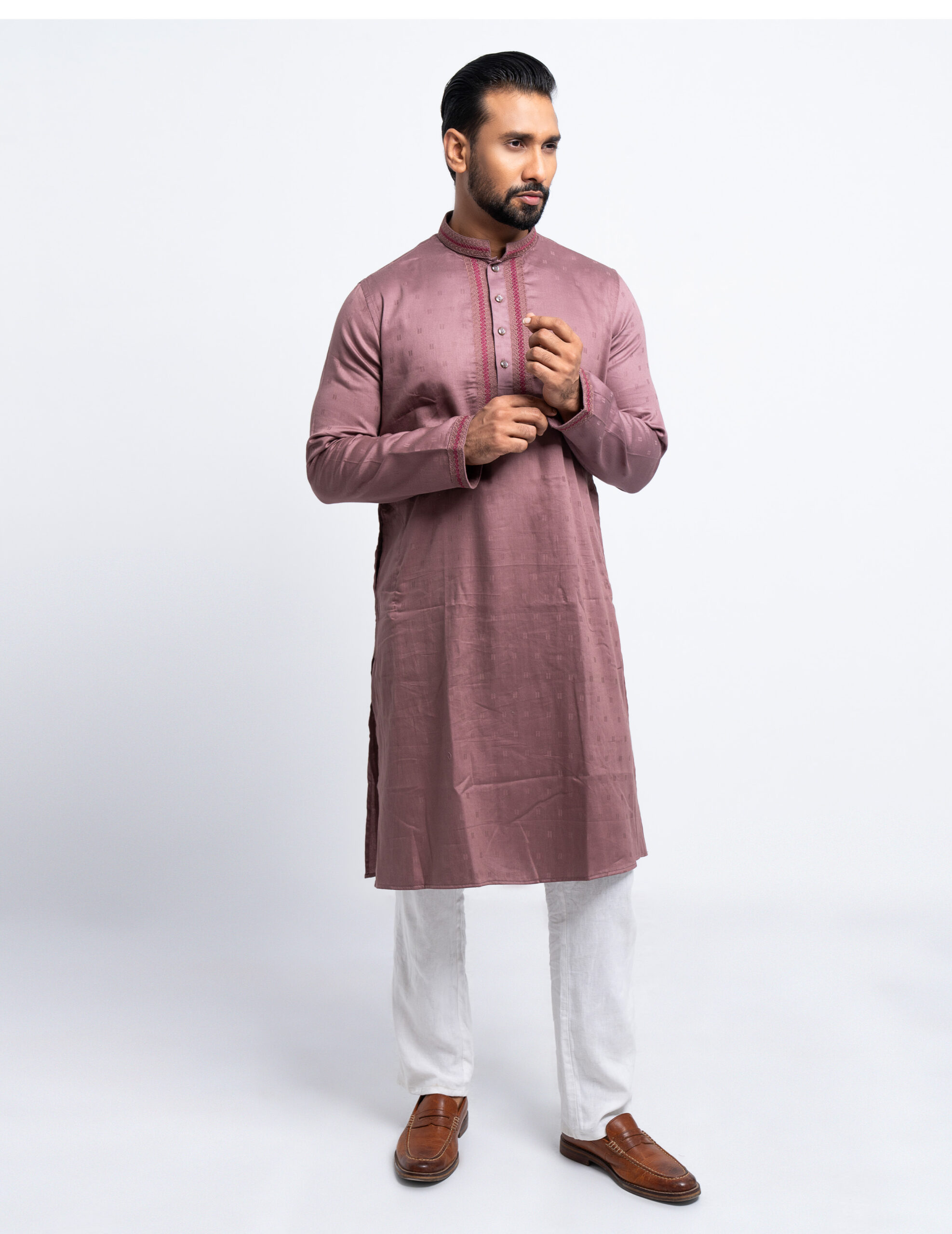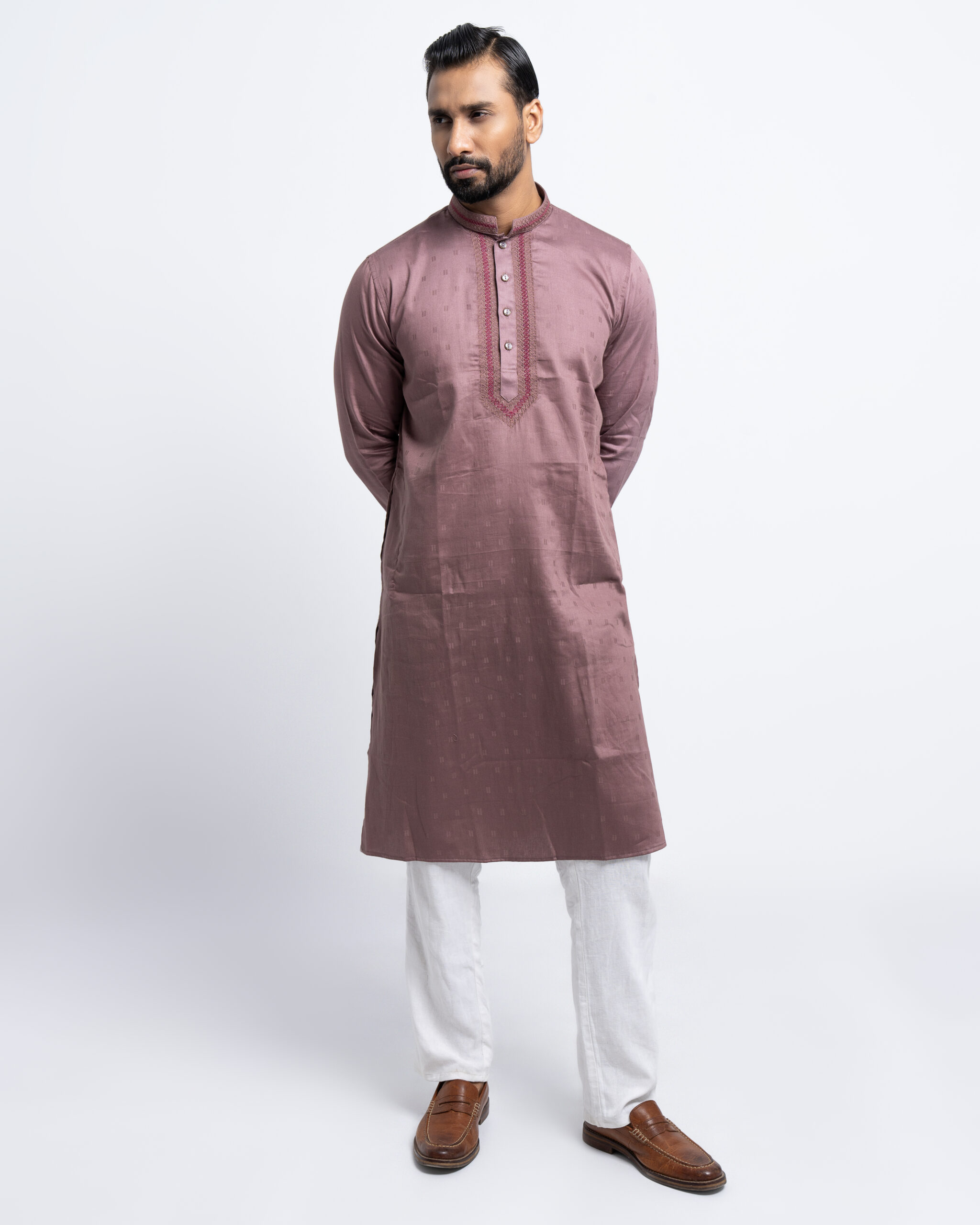 Experience timeless elegance with this Greish Purple Panjabi, crafted from 100% Cotton Jacquard fabric. The intricate jacquard weave adds a touch of sophistication, making it a perfect blend of tradition and modern refinement. Designed for both comfort and style, this Panjabi ensures a luxurious feel while maintaining a breathable and lightweight texture.